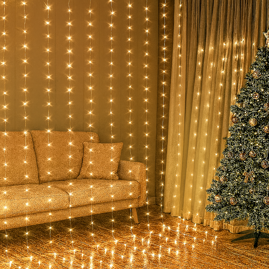 Varázsolj otthonos, kuckózós hangulatot ezzel a 3×2,8 méteres, 300 ledes melegfehér LED fényfüggönnyel! A sűrűn elhelyezett apró LED-ek puha, aranyszínű fényt adnak, ami tökéletes karácsonyi dekorációnak, hálószobába, nappaliba, fotóhátterekhez vagy akár egy romantikus esti hangulat megteremtéséhez.