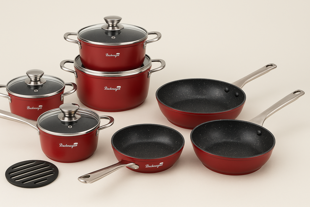 A Bachmayer Home BM-7311 egy látványos, burgundi piros 11 részes edény- és serpenyőkészlet, mindennapi főzéshez és sütéshez. A gránit hatású, márványozott fekete tapadásmentes bevonatnak köszönhetően az ételek nem ragadnak le, kevesebb zsiradékkal is könnyen dolgozhatsz, a tisztítás pedig pár mozdulat.