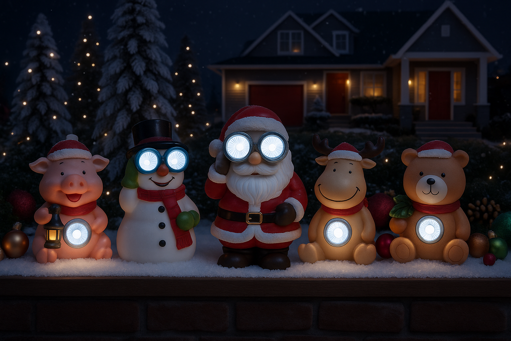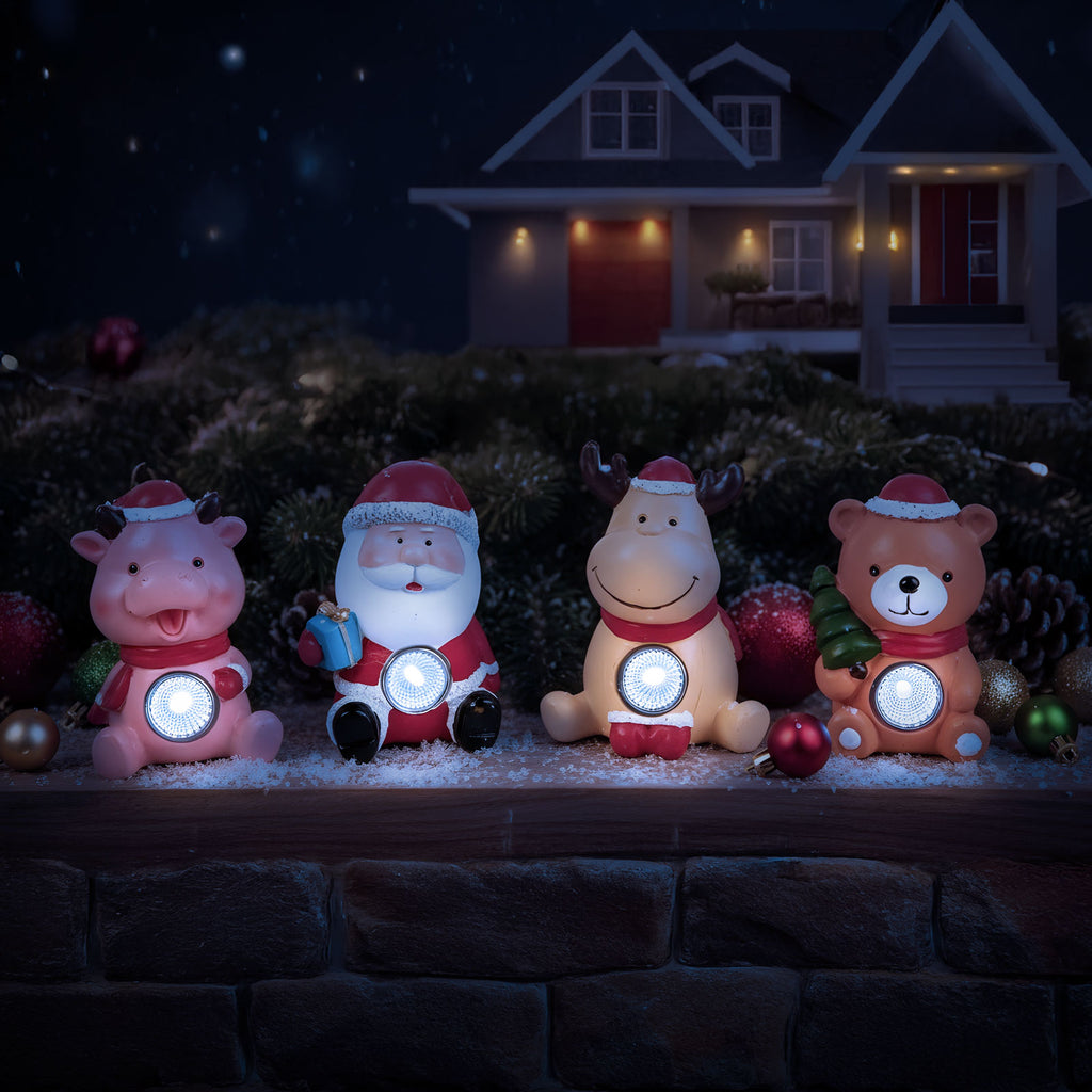Mesés karácsonyi LED kerti figura szett öt aranyos szereplővel: Mikulás, hóember, rénszarvas, maci és malac, mindegyik beépített fényforrással a varázslatos ünnepi hangulatért.